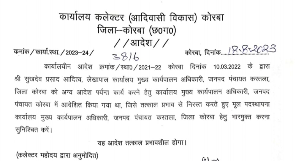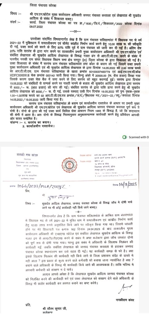 बता दें कि करतला जनपद पंचायत में पदस्थ रहे लेखपाल सुखदेव आदित्य पर आरोप लगाया गया था कि उनके द्वारा 200000 की राशि जारी करने की एवज में 8000 रुपये की रिश्वत सरपंच से ली गई। सरपंच ने 8000 रुपये दिया, तब जाकर राशि लेखपाल के द्वारा जारी की गई। इस पर भी लेखापाल ने दो लाख रुपए जारी करने के बाद उसे रिकॉर्ड में 20000 रुपये दर्शाया। इस तरह से वित्तीय अनियमितता भी की गई। रामपुर क्षेत्र के विधायक ननकी राम कंवर ने इस मामले की शिकायत की थी जिस पर जांच के उपरांत दोषी पाए जाने पर तत्कालीन सीईओ एचएन खोटेल को निलंबित कर दिया गया जबकि लेखापाल सुखदेव आदित्य को करतला से कोरबा जनपद में पदस्थ करने का आदेश जारी किया गया। हाल ही में सुखदेव आदित्य को कोरबा जनपद से हटाकर करतला जनपद में पदस्थापना का आदेश सहायक आयुक्त आदिवासी विकास विभाग के द्वारा जारी किया गया है। विधायक ननकी राम कंवर ने एक पत्र कलेक्टर सौरव कुमार को लिखते हुए सवाल उठाया है कि इस मामले में दोषी पाए जाने के बाद भी सुखदेव आदित्य के विरुद्ध अनुशासनात्मक कार्यवाही/निलंबन आदि क्यों नहीं किया गया?उसे कोरबा से पुनः करतला जनपद में पदस्थ किया जा रहा है। श्री कंवर ने इस मामले में लेखापाल पर विधिवत कार्रवाई की मांग की है।