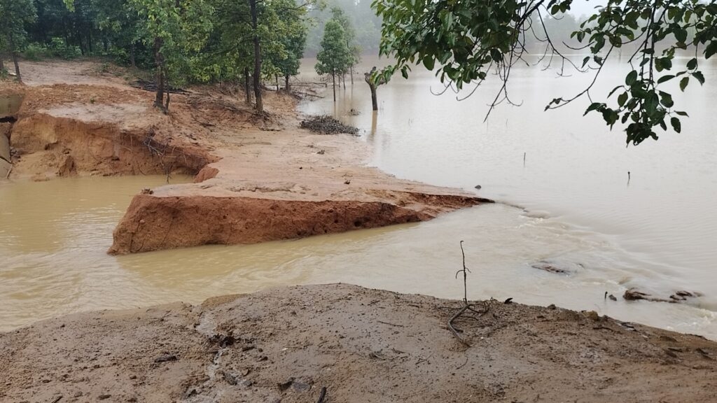 कोरबा(खटपट न्यूज़)। कोरबा जिले में भ्रष्टाचार का बांध देखना है तो कहीं दूर जाने की जरूरत नहीं है यह नजारा आप ग्राम सोलवा में देख सकते हैं जहां अफसर और ठेकेदार ने 65 लाख की लागत से जलाशय का निर्माण कराया था यह जलाशय निर्माण कार्य पूर्ण होने के महज डेढ़ माह बाद 48 घंटे हुई बारिश से धराशाई हो गया। पानी के तेज बहाव में निकासी के लिए बनाया गया नहर पूरी तरह टूटकर छतिग्रस्त हो गयी वही बंड से जगह जगह मिट्टी बह गई है जिसे बचाने तिरपाल का सहारा लिया जा रहा है।