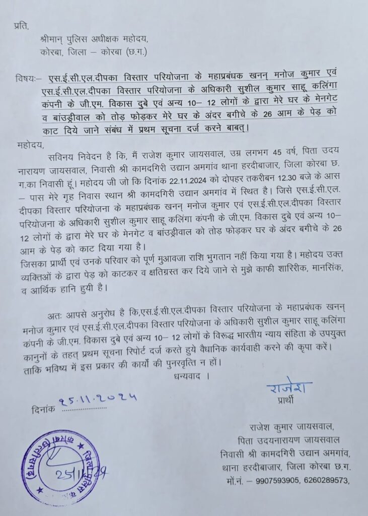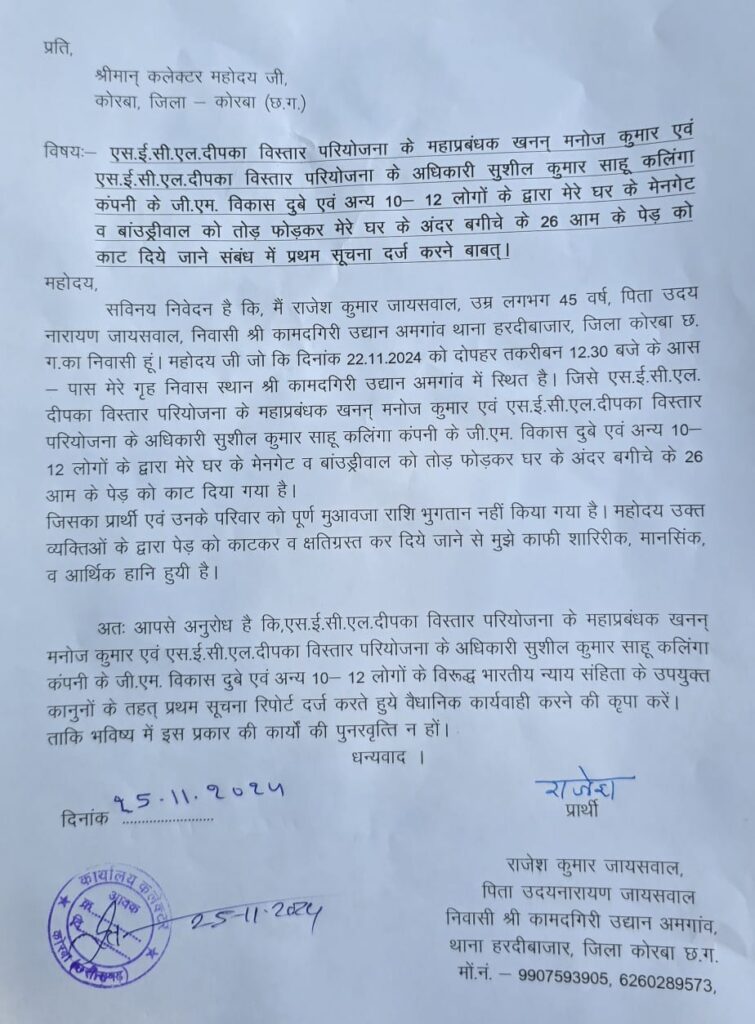 राजेश कुमार जायसवाल ने जारी शिकायत पत्र में बताया है कि एसईसीएल दीपका विस्तार परियोजना के महाप्रबंधक खनन मनोज कुमार एवं एसईसीएल दीपका विस्तार परियोजना के अधिकारी सुशील कुमार साहू कलिंगा कंपनी के जीएम विकास दुबे एवं अन्य 10-12 लोगों के द्वारा उनके घर के मेनगेट व बांउड्रीवाल को तोड़ फोडक़र घर के अंदर बगीचे के 26 आम के पेड़ को काट दिए गए है।