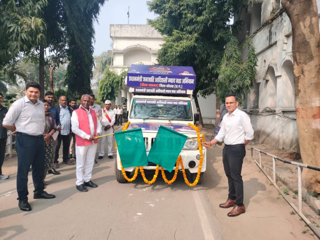 कोरबा (खटपट न्यूज)। कलेक्टर श्री सौरभ कुमार ने आज कलेक्ट्रेट परिसर से जिले में पीएम जनमन योजना के व्यापक प्रचार-प्रसार हेतु प्रधानमंत्री जनजाति आदिवासी न्याय महा अभियान के प्रचार रथ को हरी झंडी दिखाकर रवाना किया। उन्होंने रथ के माध्यम से अधिक से अधिक प्रचार प्रसार कर जिले के विशेष पिछड़ी जनजाति के लोगों को जागरूक करने एवं उन्हें योजनाओ से लाभान्वित करने के निर्देश दिए। इस अवसर पर सीईओ जिला पंचायत श्री विश्वदीप, सहायक आयुक्त आदिम जाति विकास विभाग श्री श्रीकांत कसेर सहित अन्य अधिकारी कर्मचारी उपस्थित थे ।
