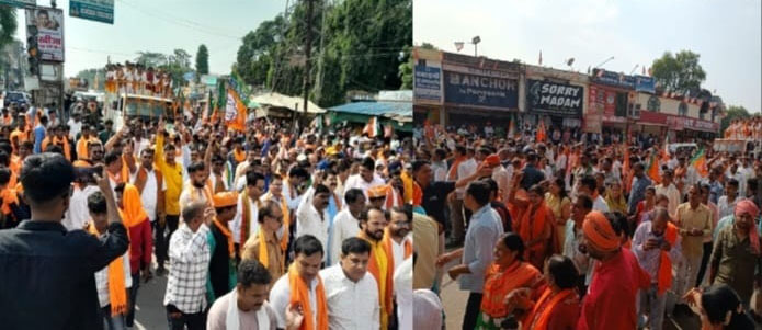 नामांकन से पहले घंटाघर चौक में हजारों की संख्या में पार्टी पदाधिकारी एवं जिले भर से आए कार्यकर्ता सहित नगरजन एकत्र हुए। यहां पर प्रत्याशी लखनलाल देवांगन कोरबा, ननकीराम कंवर रामपुर, प्रेमचंद पटेल कटघोरा व रामदयाल उईके पाली-तानाखार सहित वरिष्ठ पदाधिकारी खुले वाहन में सवार हुए। सुसज्जित खुले वाहन में सवार चारों प्रत्याशियों को लेकर कार्यकर्ताओं का काफिला घंटाघर मैदान के सामने से प्रारंभ हुआ और कोसाबाड़ी चौक तक रैली की शक्ल में पहुंचा। इस दौरान पूरे मार्ग में पार्टी का झंडा को हाथ में लिए कार्यकर्ता जोश में दिखाई दिए। गगनभेदी नारे और करमा दलों की थाप पर कार्यकर्ता पार्टी प्रत्याशियों के जीत के लिए वोट देने की अपील करते रहे। घंटाघर से कोसाबाड़ी चौक तक की दूरी लगभग एक घंटे में तय की जा सकी। सभी प्रत्याशी कोसाबाड़ी चौक से पैदल कलेक्ट्रेट पहुंचे और विधिवत नामांकन दाखिल किया।
