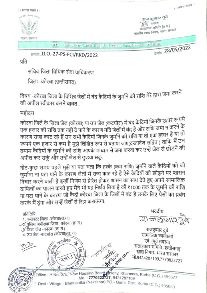 कोरबा(खटपट न्यूज़)। खाद्य निगम, भारत सरकार सलाहकार समिति छत्तीसगढ़,कोरबा के पूर्व सदस्य व सामाजिक कार्यकर्ता राजकुमार दुबे ऐसे बंदियों को मदद देंगे जो आर्थिक कारणों से राशि भुगतान नहीं कर सकने के कारण जेल में हैं।