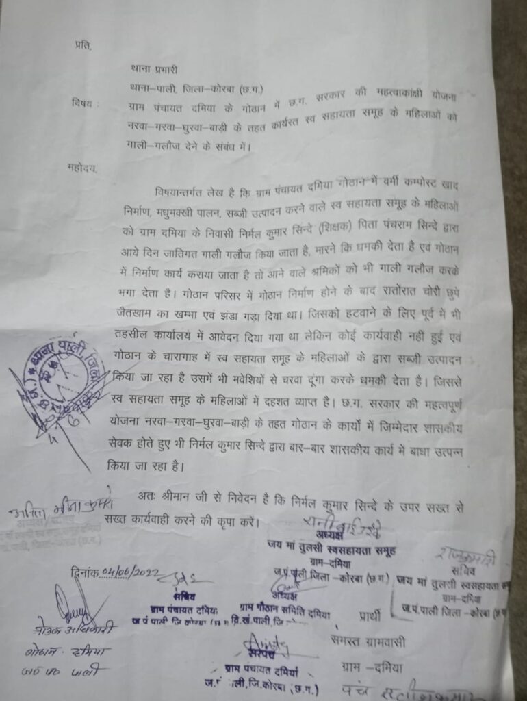 कोरबा-पाली(खटपट न्यूज़)। विकासखंड पाली के ग्राम पंचायत दमिया की गौठान में वर्मी कम्पोस्ट खाद निर्माण,मधुमख्खी पालन,सब्जी उत्पादन करने वाले स्व सहायता समूह की महिलाओं ने ग्राम के एक शिक्षक पर दुर्व्यवहार का आरोप लगाते हुए जिलाधीश से शिक्षक के विरुद्ध जांच एवं न्यायोचित कार्यवाही की मांग की है।