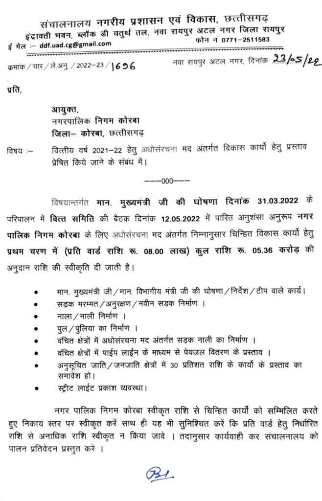 कोरबा(खटपट न्यूज़)। छत्तीसगढ़ शासन के नगरीय प्रशासन विभाग ने वार्डों में अधोसंरचना मद के कार्यों की स्वीकृति प्रदान कर दी है। वार्डों में लंबे समय से विकास कार्य अवरुद्ध पड़े हुए हैं। इसके लिए हर बार मद की कमी बताई जा रही थी।