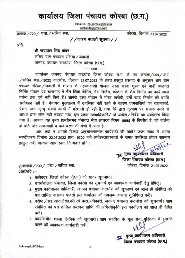 गया है। सचिव जयपाल सिंह कंवर के इस कृत्य को (छत्तीसगढ़ पंचायत सेवा आचरण नियम 1998) के विपरीत व कर्त्तव्य के प्रति घोर लापरवाही व कदाचरण की श्रेणी का बताया गया है। नोटिस में सचिव को कहा गया है कि क्यों न उसके विरूद्ध अनुशासनात्मक कार्यवाही की जावे? उक्त संबंध में स्पष्टीकरण प्रस्तुत करने कहा गया है।