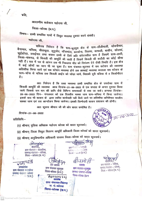 कलेक्टर को सौंपे आवेदन में उल्लेख है कि कुदमुरा क्षेत्र के तौलीपाली, बैगामार, चचिया, लुदूखेत, धौराभाठा, कुदमुरा,तराई मार,कछार,जिल्गा, कटकोना, बरपाली,शनिदेरा, दादर पारा, बसीन,सोलवां आदि गाँव हाथी प्रभावित सहित अतिसंवेदनशील है। इन गाँवो में हाटी सबस्टेशन से बिजली की आपूर्ति की जाती है,बिजली की कटौती लगातार जारी है। मांग है कि कुदमुरा में सबस्टेशन स्थापित किया जाए और करतला से 11 केव्ही को चचिया से जोड़ा जाय। इन मांगों को लेकर 28 जून को चचिया में चक्काजाम आन्दोलन किया जाएगा।