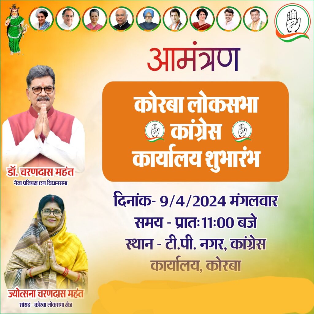 कोरबा (खटपट न्यूज)। हिन्दू नववर्ष व नवरात्रि के अवसर पर कोरबा लोकसभा कांग्रेस कार्यालय टीपी नगर का शुभारंभ 9 अप्रैल को सुबह 11 बजे किया जाएगा। इस अवसर पर कोरबा लोकसभा अंतर्गत जिला कांग्रेस कोरबा व कोरिया के पदाधिकारी भी उपस्थित रहेंगे।