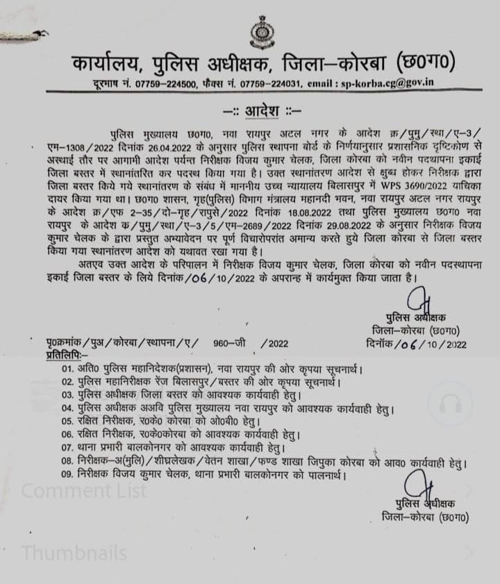 कोरबा(खटपट न्यूज़)। कोरबा जिला पुलिस बल के अंतर्गत बाल्को थाना में पदस्थ निरीक्षक विजय चेलक को नई पदस्थापना स्थल बस्तर जिला के लिए कार्य मुक्त कर दिया गया। कोरबा जिला पुलिस अधीक्षक संतोष सिंह ने इस आशय का आदेश जारी किया है। श्री चेलक 6 अक्टूबर को कार्यमुक्त कर दिए गए हैं। बता दें कि श्री चेलक ने अपने तबादला के विरुद्ध न्यायालय की शरण ली थी और नक्सल क्षेत्रों में लंबे समय से पदस्थापना के बाद फिर से नक्सली क्षेत्र में पदस्थ किए जाने पर उन्होंने अपना एतराज दर्ज कराया था। विचाराधीन मामले में न्यायालय ने उनके अपील को निरस्त कर दिया है