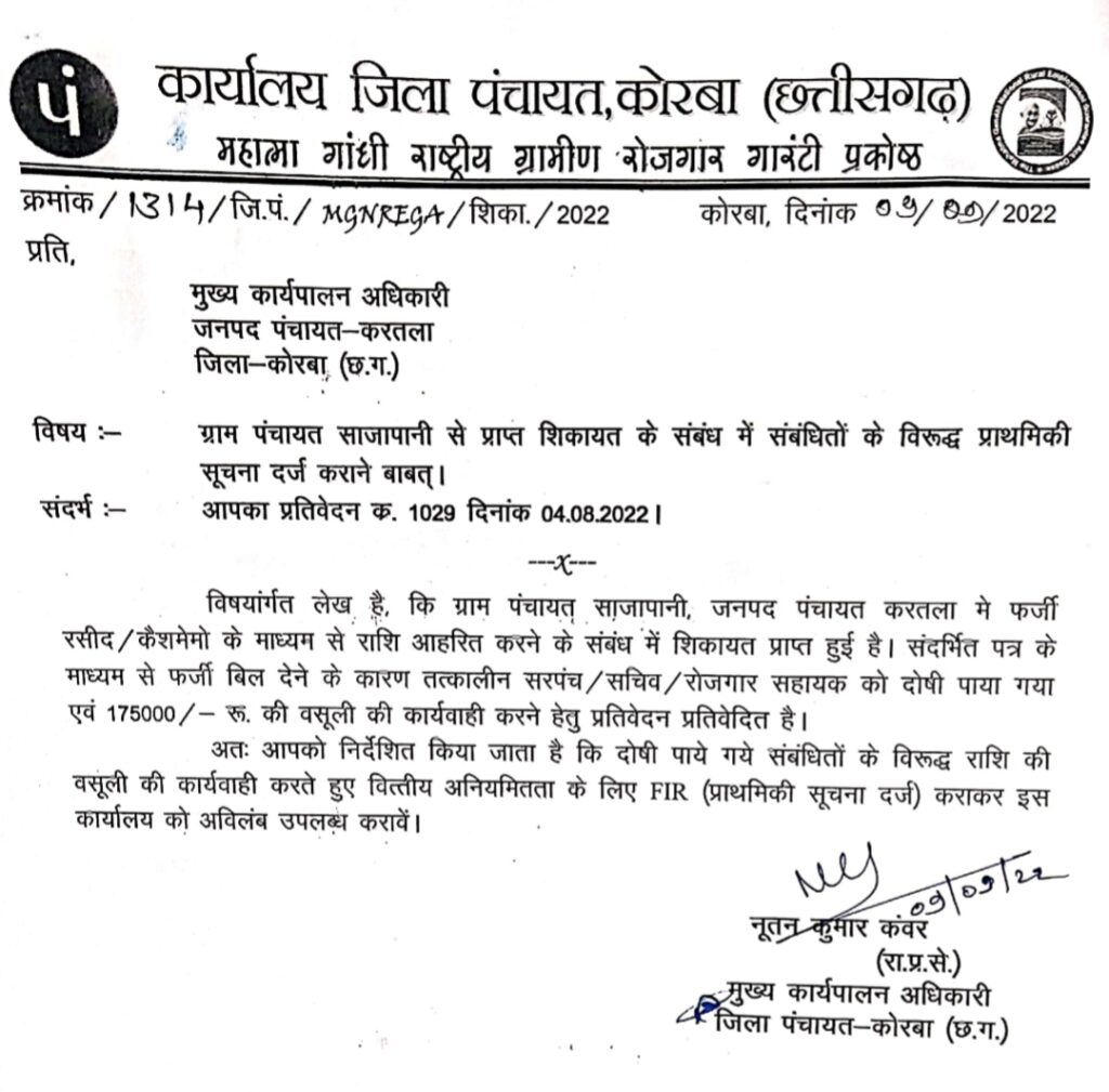 इसके पश्चात एक अन्य पत्र जिला पंचायत सीईओ के द्वारा 9 सितंबर 2022 को करतला जनपद सीईओ के नाम जारी किया गया। इस पत्र में संबंधित लोगों के विरुद्ध एफआईआर कराने के लिए निर्देशित किया गया है लेकिन 10 दिन बाद भी एफआईआर कराने की फुर्सत जनपद सीईओ को नहीं मिली है।