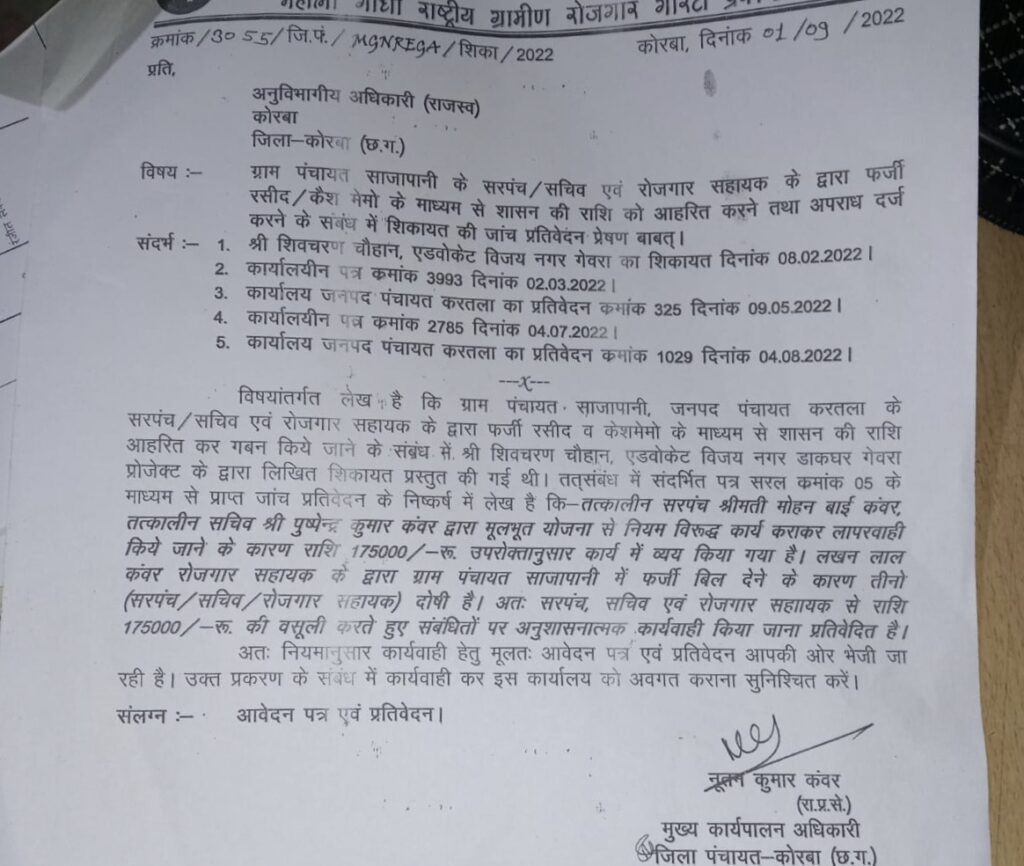 तत्संबंध में संदर्भित पत्र के माध्यम से प्राप्त जांच प्रतिवेदन के निष्कर्ष में जिला पंचायत सीईओ नूतन कंवर के द्वारा 1 सितंबर 2022 को कोरबा एसडीएम हरिशंकर पैकरा को पत्र जारी कर अवगत कराया है कि तत्कालीन साजापानी सरपंच श्रीमती मोहन बाई कंवर, तत्कालीन सचिव पुष्पेन्द्र कुमार कंवर द्वारा मूलभूत योजना से नियम विरूद्ध कार्य कराकर लापरवाही किये जाने के कारण राशि 175000/- रू. उपरोक्तानुसार कार्य में व्यय किया गया है। लखन लाल कंवर रोजगार सहायक के द्वारा ग्राम पंचायत साजापानी में फर्जी बिल देने के कारण तीनों (सरपंच/सचिव/रोजगार सहायक) दोषी हैं। अतः सरपंच, सचिव एवं रोजगार सहाायक से राशि 1लाख 75000 रूपए की वसूली करते हुए संबंधितों पर अनुशासनात्मक कार्यवाही किया जाना प्रतिवेदित है। नियमानुसार कार्यवाही हेतु मूलतः आवेदन पत्र एवं प्रतिवेदन एसडीएम को प्रेषित कर प्रकरण के संबंध में कार्यवाही कर जिला पंचायत कार्यालय को अवगत कराना सुनिश्चित करने कहा गया है।विडंबना है कि उक्त पत्र पर आज पर्यंत कार्यवाही सुनिश्चित नहीं हो सकी है।