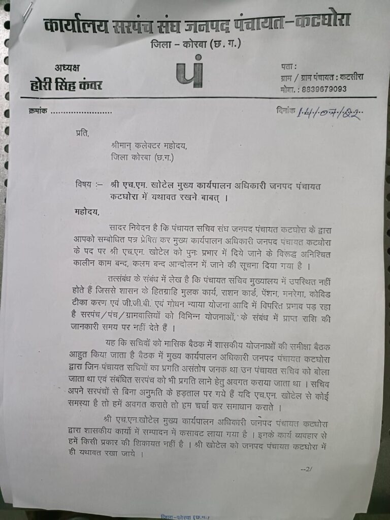 इधर दूसरी और श्री खोटेल ने अपना कामकाज संभाल लिया है। सूत्र बताते हैं कि उन्हें हाई कोर्ट से आदेश मिला है और इसके आधार पर वे यहां पदस्थ हुए हैं अब इस पूरे मामले में ट्विस्ट है कि सरपंच संघ जनपद पंचायत कटघोरा, सीईओ के समर्थन में खड़ा हो गया है। इन्होंने सचिवों पर आरोप लगाते हुए कहा है कि श्री खोटेल कामकाज में कसावट लाने लगे थे इसलिए उन्हें हटाने की जद्दोजहद शुरू की गई। अनेक सरपंचों ने जिला मुख्यालय पहुंचकर कलेक्टर को हालातों से अवगत कराया और श्री खोटेल को कटघोरा जनपद में ही यथावत पदस्थ रहने देने की मांग रखी। सरपंच संघ ने हड़ताल पर जाने वाले सचिवों के विरुद्ध अनुशासनात्मक कार्यवाही की भी मांग की है।