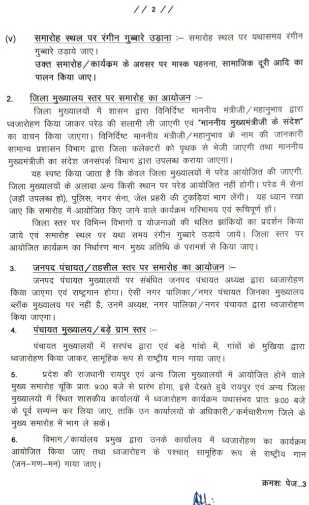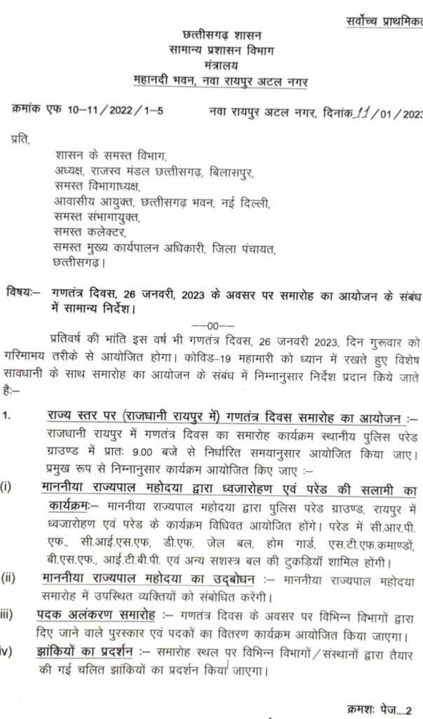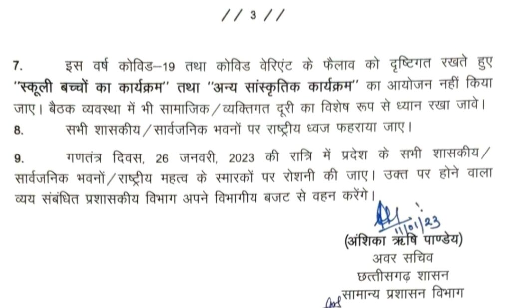 रायपुर(खटपट न्यूज़)। गणतंत्र दिवस के अवसर पर इस वर्ष भी कोविड-19 की छाया रहेगी। समारोह आयोजन के संबंध में कोविड-19 के दृष्टिगत निर्देश/ प्रोटोकॉल जारी कर दिए गए हैं। गणतंत्र दिवस पर झंडारोहण होगा, परेड भी किया जाएगा, झांकियां भी निकलेगी लेकिन स्कूली विद्यार्थियों के द्वारा प्रस्तुत किए जाने वाले व अन्य तरह के सांस्कृतिक कार्यक्रम नहीं होंगे। आयोजन स्थल पर कोविड प्रोटीकॉल नियमों का पालन करना होगा