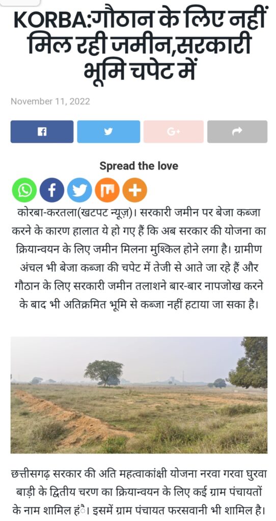 कोरबा(खटपट न्यूज़)। सरकारी जमीन पर बेजा कब्जा करने के कारण ग्राम पंचायत फरसवानी में गौठान निर्माण के लिए जमीन नहीं मिलने सम्बन्धी खटपट न्यूज़ की खबर का असर हुआ है। गौठान निर्माण के लिए 4-4 बार नाप-जोख करने के बाद भी सरकारी जमीन की तलाश पूरी नहीं हो पाने के मामले में जनपद पंचायत करतला की सीईओ रुचि शार्दुल ने संज्ञान लिया और निर्देश पर जमीन की तलाश पूरी करते हुए गौठान निर्माण का कार्य शुरू करा दिया है।