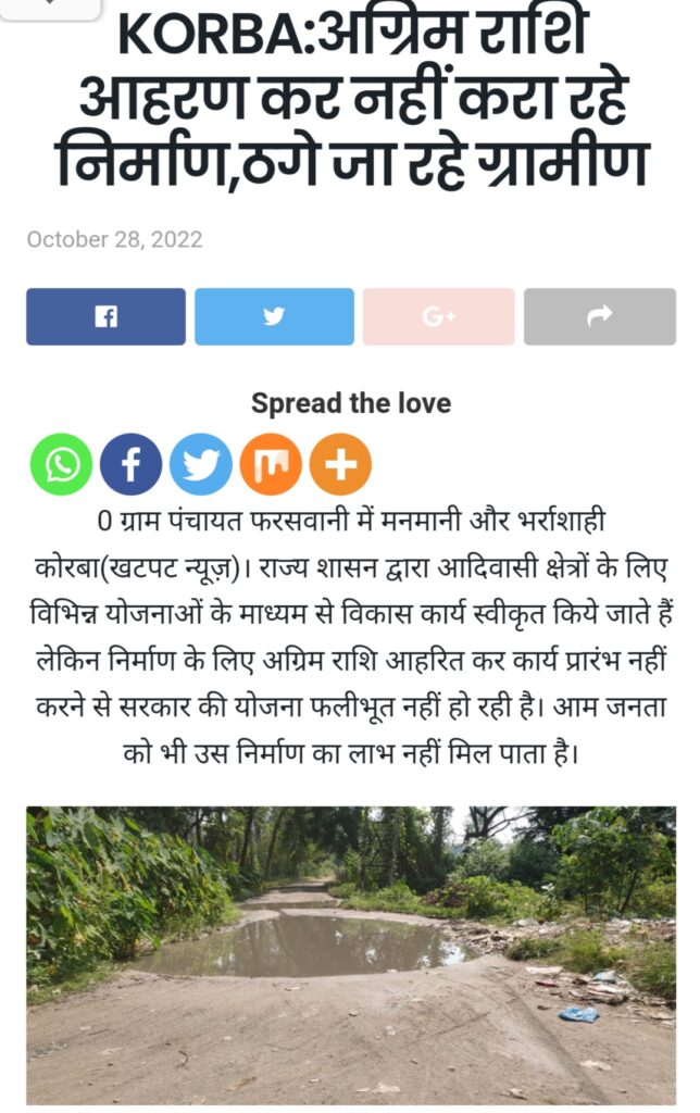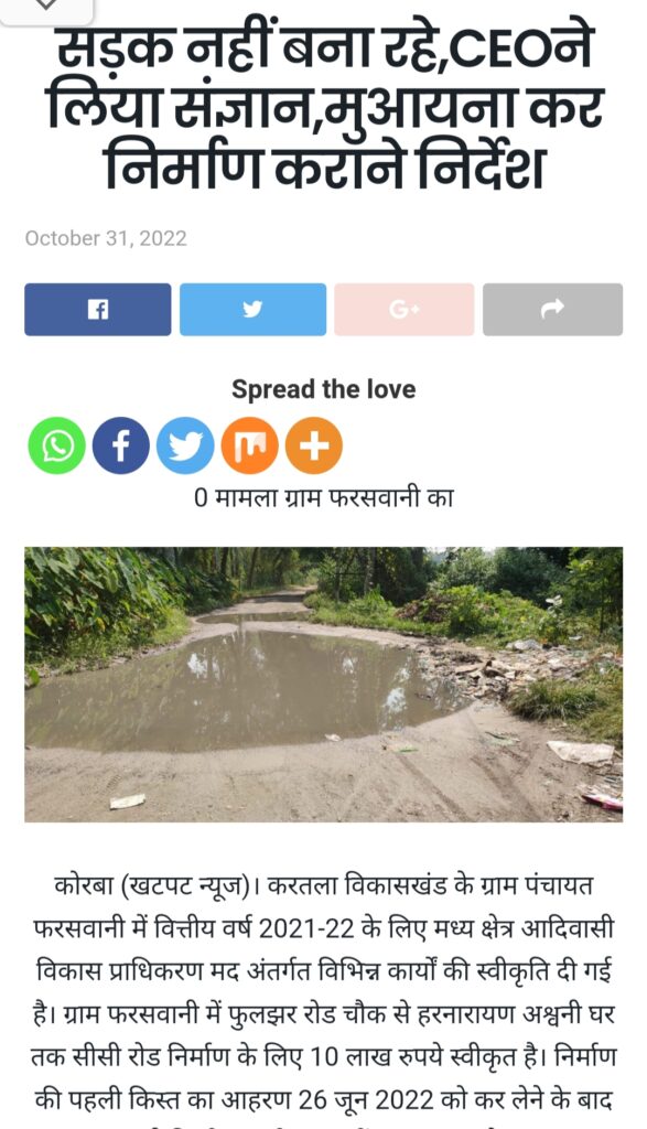 बता दें कि वित्तीय वर्ष 2021-22 के लिए मध्य क्षेत्र आदिवासी विकास प्राधिकरण मद अंतर्गत विभिन्न कार्यों की स्वीकृति दी गई है। ग्राम फरसवानी में फुलझर रोड चौक से हरनारायण अश्वनी घर तक सीसी रोड निर्माण के लिए 10 लाख रुपये स्वीकृत है। निर्माण की पहली किस्त का आहरण 26 जून 2022 को कर लेने के बाद भी निर्माण कार्य शुरू नहीं कराया गया था। सीसी रोड की राशि 10 लाख में से 40 फीसदी रकम आहरण कर लेने के 4 माह बाद भी रेत, गिट्टी आदि उक्त स्थान पर नहीं गिराया जा सका था। खटपट न्यूज ने यह मामला पिछले दिनों प्रकाश में लाया जिसे करतला जनपद पंचायत की सीईओ डिप्टी कलेक्टर रुचि शार्दुल ने गंभीरता से लेकर स्वयं उक्त मौका स्थल पर पहुंचकर सड़क की हालत को देखा और नाराजगी भी जाहिर की थी।
