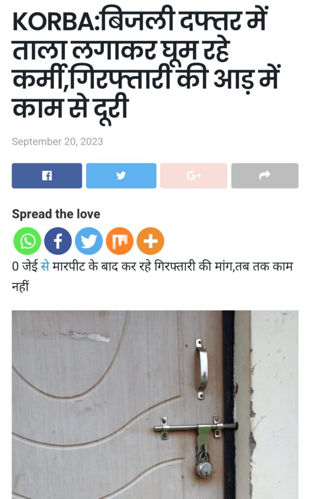 कोरबा(खटपट न्यूज)। पिछले दिनों राज्य विद्युत वितरण कंपनी के बरपाली स्थित सब स्टेशन में पदस्थ जेई संदीप मानिकपुरी से 15 सितम्बर को ग्राम उमरेली में ग्रामीणों द्वारा मारपीट की गई। घटना के बाद उरगा थाना में दर्ज अपराध में आरोपियों की गिरफ्तारी नहीं होने को लेकर बरपाली सोहागपुर के विद्युत कर्मियों ने काम नहीं करने की चेतावनी भरा पत्र वरिष्ठ अधिकारियों को 18 सितम्बर को सौंपा था। इसके बाद कर्मचारियों के द्वारा दफ्तर का ताला ही नहीं खोला गया और दफ्तर बंद करके अपने निजी कार्यों में लग रहे। इनके काम बंद करने की स्थिति में विद्युत सुधार संबंधी व अन्य कार्यों के लिए कोई वैकल्पिक व्यवस्था नहीं की गई। इधर विद्युत संबंधी कामकाज के लिए सब स्टेशन पहुंचने वाले ग्रामीणों को भटकना पड़ा। इस तरह की लापरवाही और मनमानी के संज्ञान में आने उपरांत खटपट न्यूज़ ने इस खबर को प्रमुखता से प्रसारित किया। यह बात संज्ञान में आने पर अधिकारियों ने इसे गंभीरता से लेते हुए संबंधित कर्मचारियों को कम पर लौटने के निर्देश दिए हैं। इसके पश्चात कर्मचारी अपनी हड़ताल से वापस लौट आए हैं। उम्मीद है कि कल से बरपाली सब स्टेशन में कामकाज सुचारू रूप से चलने लगेगा।
