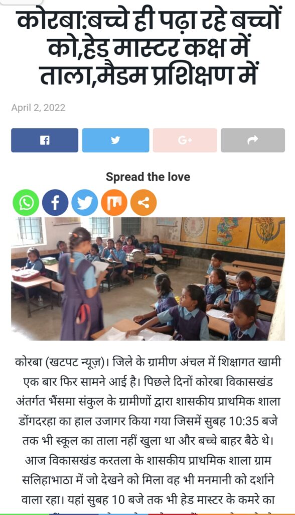 बता दें कि खटपट न्यूज़ ने प्राथमिक शाला सलिहाभाठा में मौजूद अव्यवस्था को सबसे पहले उजागर किया। यहां 2 अप्रैल 2022 को सुबह 10 बजे तक भी प्रधान पाठक नहीं पहुंचे थे और शिक्षिका प्रमिला राज को प्रशिक्षण में जाना बताया गया। बच्चे खुद से ही क्लास में पढ़ाई करते नजर आए।