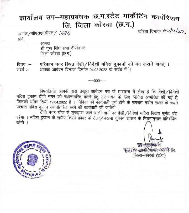 कोरबा (खटपट न्यूज)। गुरु सिंह सभा टीपी नगर स्टेडियम मार्ग स्थित पंजाबी गुरुद्वारा जाने वाले मार्ग में संचालित हो रहे देशी/विदेशी मदिरा दुकान को बंद करने की मांग आखिरकार पूरी हो गई है। छग स्टेट मार्केटिंग कार्पोरेशन लिमिटेड कोरबा के उप महाप्रबंधक द्वारा इस संबंध में एक पत्र गुरु सिंह सभा के अध्यक्ष को जारी कर अवगत कराया गया है कि टीपी नगर के देशी-विदेशी मदिरा दुकान को स्थानांतरित करने हेतु नए भवन के लिए निविदा आमंत्रित की गई है, जिसकी अंतिम तिथि 19 अप्रैल 2022 है। निविदा की कार्यवाही पूर्ण होने व नवीन स्थल के चयन उपरांत मदिरा दुकान स्थानांतरित की जाएगी। टीपी नगर चौक से गुरुद्वारा जाने वाले मार्ग पर देशी-विदेशी मदिरा विक्रय पूर्णत: बंद रहेगा। मदिरा दुकान के समीप किसी प्रकार के ठेला/चखना दुकान नियमानुसार प्रतिबंधित रहेंगे।