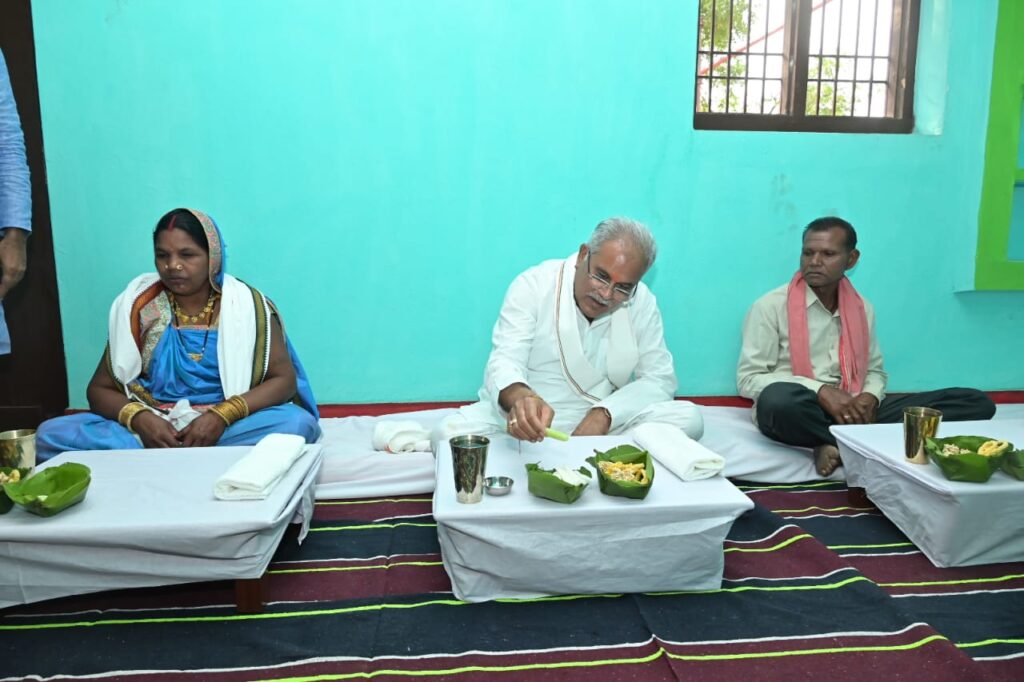 मुख्यमंत्री श्री भूपेश बघेल ने ग्राम सिवनी (नैला) निवासी किसान श्री छोटेलाल बरेठ के घर पलास पत्तो के दोना और फुलकांस की थाली में बड़ी ही सादगी के साथ छत्तीसगढ़ी पारंपरिक भोजन का लिया स्वाद