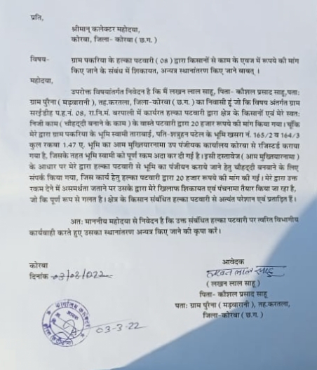 कोरबा(खटपट न्यूज़)। राजस्व संबंधी कामकाज के लिए किसी भी तरह के रुपए की मांग नहीं करने के आरोपों को जहां समय-समय पर राजस्व अमले से जुड़े लोग दरकिनार करते रहे हैं वहीं आए दिन इस तरह की शिकायतें भी सामने आती हैं कि विभिन्न काम के संबंध में पटवारियों द्वारा रुपए मांगे जा रहे हैं। पिछले दिनों हुई एक शिकायत पर अभी तक कार्यवाही लंबित है वहीं दूसरी ओर करतला ब्लॉक के ही सरईडीह हल्का नंबर 8 के पटवारी पर 20 हजार रुपये रिश्वत मांगने का आरोप लगा है। ग्राम पुरैना मड़वारानी के रहने वाले लखन लाल साहू को जमीन पंजीयन कराने के लिए अपने निजी भूमि की चौहद्दी बनवानी है। इसके लिए वह पटवारी के पास गया तो 20 हजार रुपये की मांग चौहद्दी बनाने के लिए की गई। लखनलाल साहू ने कलेक्टर से इसकी शिकायत करते हुए उचित कार्यवाही एवं चौहद्दी बनवाने की मांग प्रशासन से की है। देखना यह है कि प्रकरण में लखनलाल साहू को कब तक न्याय मिल पाता है।