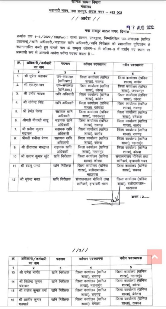 रायपुर (खटपट न्यूज)। छत्तीसगढ़ शासन के खनिज विभाग में बड़ी संख्या में तबादले हुए हैं। डिप्टी डायरेक्टर से लेकर खनिज अधिकारी, खनिज निरीक्षक व सहायक खनिज अधिकारी के बड़ी संख्या में ट्रांसफर आर्डर जारी किया गया है। कुल 16 अधिकारियों के ट्रांसफर आर्डर जारी किये गये हैं।