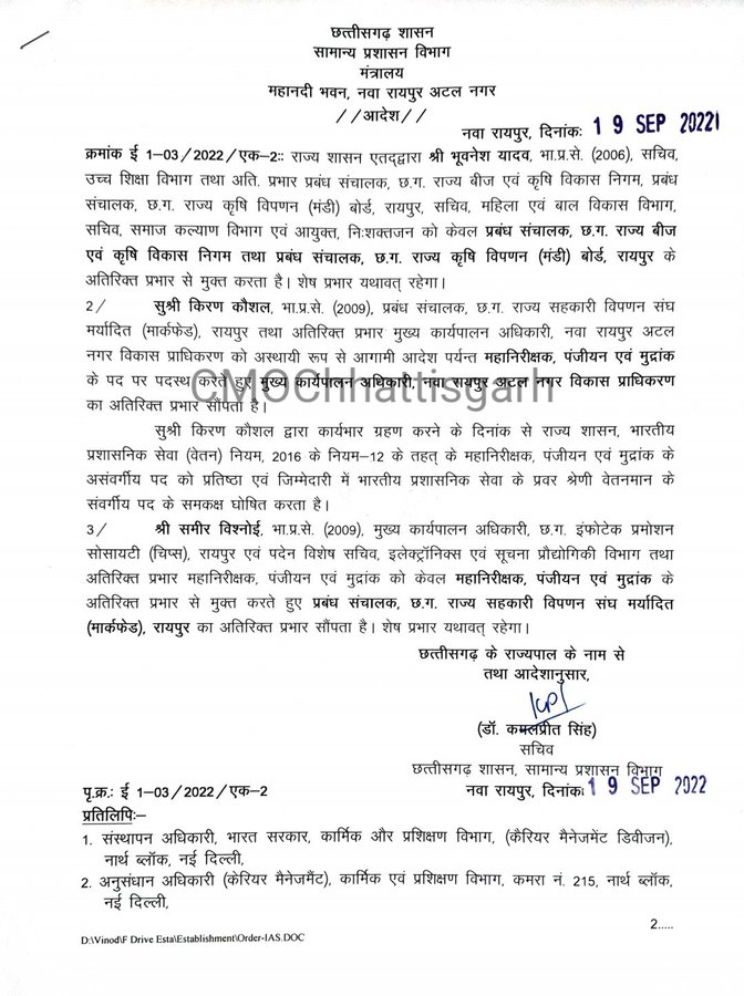 रायपुर (खटपट न्यूज)। राज्य शासन ने भारतीय प्रशासनिक सेवा के अधिकारियों के नवीन पदस्थापना आदेश जारी किया है. नए आदेश से प्रभावित होने वाले तीन आईएएस में किरण कौशल, भुवनेश यादव और समीर विश्नोई शामिल हैं. सामान्य प्रशासन विभाग की ओर से 19 सितंबर को जारी आदेश में किरण कौशल को नवा रायपुर अटल नगर विकास प्राधिकरण के मुख्य कार्यपालन अधिकारी का अतिरिक्त प्रभार दिया गया है, इसके साथ भुवनेश यादव से राज्य बीज एवं कृषि विकास निगम और राज्य कृषि विपणन बोर्ड के प्रबंध संचालक के अतिरिक्त प्रभार से मुक्त किया गया है। इसके अलावा समीर विश्नोई को महानिरीक्षक, पंजीयन एवं मुद्रांक के अतिरिक्त प्रभार से मुक्त करने के साथ राज्य सहकारी विपणन संघ का प्रबंध संचालक का अतिरिक्त प्रभार सौंपा गया है।