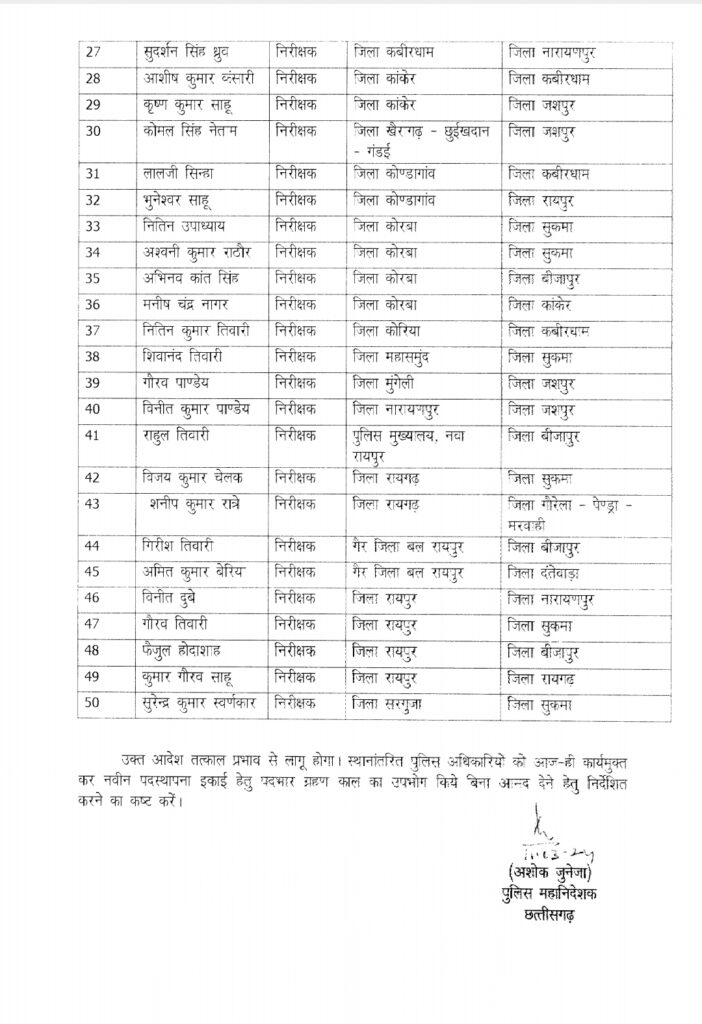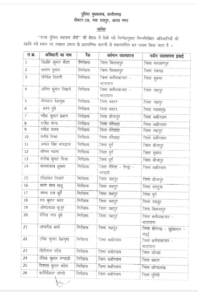 रायपुर (खटपट न्यूज)। छत्तीसगढ़ पुलिस के 50 थानेदारों के तबादले कर दिए हैं। तबादले एक जिले से दूसरे जिले और मैदानी इलाकों से नक्सल बेल्ट में भी किए गए हैं। डीजीपी के हस्ताक्षरित इस ट्रांसफर आदेश में इन थानेदारों को आज ही रिलीव करने का सख्त फरमान भी जारी किया गया है।