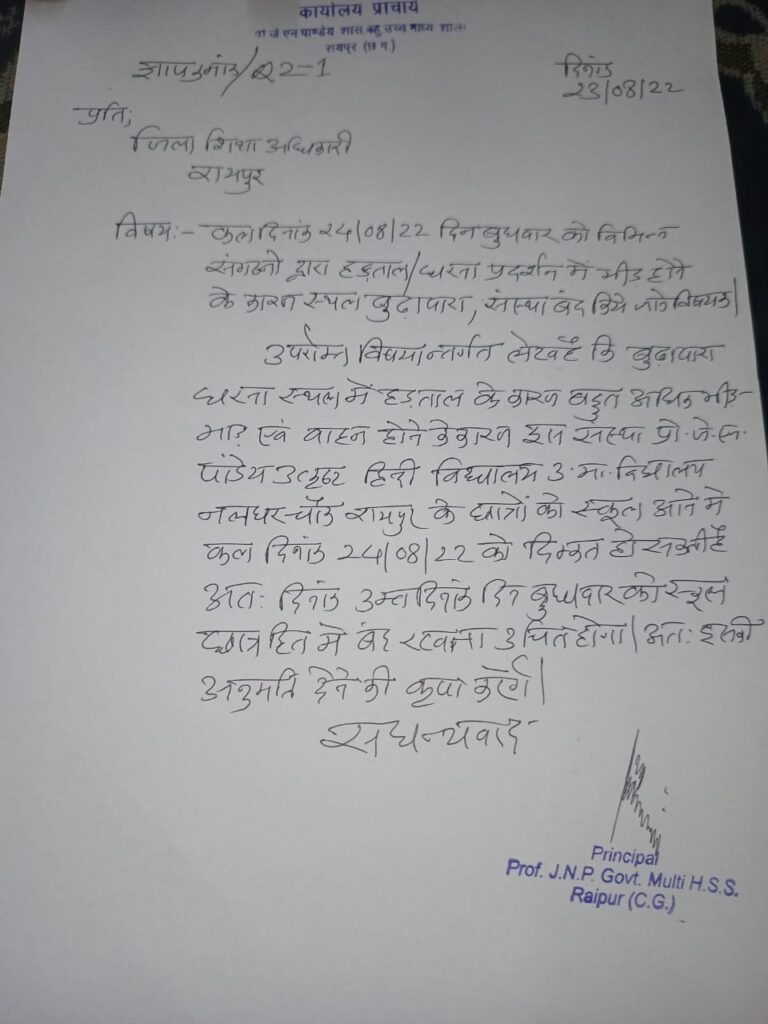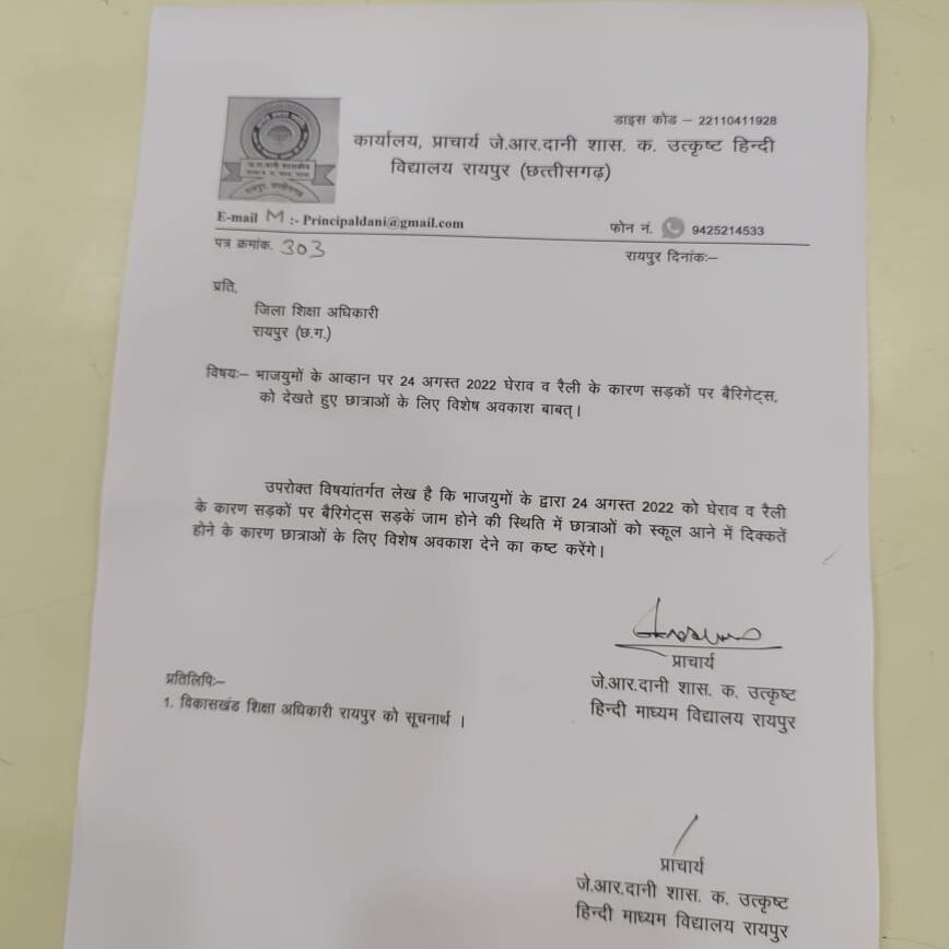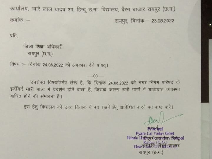 भाजयुमो के धरना प्रदर्शन से छात्रों को होगी परेशानी, स्कूलों को बंद करने मांगी अनुमति, आमजनों को भी परेशानी का करना होगा सामना