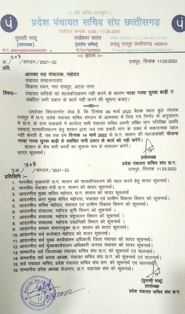 रायपुर/कोरबा(खटपट न्यूज़)। प्रदेश पंचायत सचिव संघ के द्वारा अपनी 1 सूत्रीय परिविक्षा अवधि पश्चात सरकारीकरण करने की मांग को लेकर आंदोलन किया आ रहा है। 7 मार्च को ब्लॉक व जिला स्तर पर बैठक, धरना एवं रैली उपरांत ज्ञापन सौंपा गया। 9 मार्च को राजधानी रायपुर में प्रदर्शन किया गया। अब प्रदेश पंचायत सचिव संघ के प्रांताध्यक्ष तुलसी साहू की ओर से सरकार के पंचायत संचालनालय आयुक्त सह संचालक को आज ज्ञापन पत्र दिया गया है कि उनकी मांग पर निराकरण के लिए सकारात्मक पहल नहीं होने पर 14 मार्च 2022 से नरवा गरवा घुरवा बाड़ी योजना से संबंधित कोई भी कार्य सचिव नहीं करेंगे। इसके अलावा दूसरे सभी कार्यों को सुचारू अंजाम दिया जाएगा।