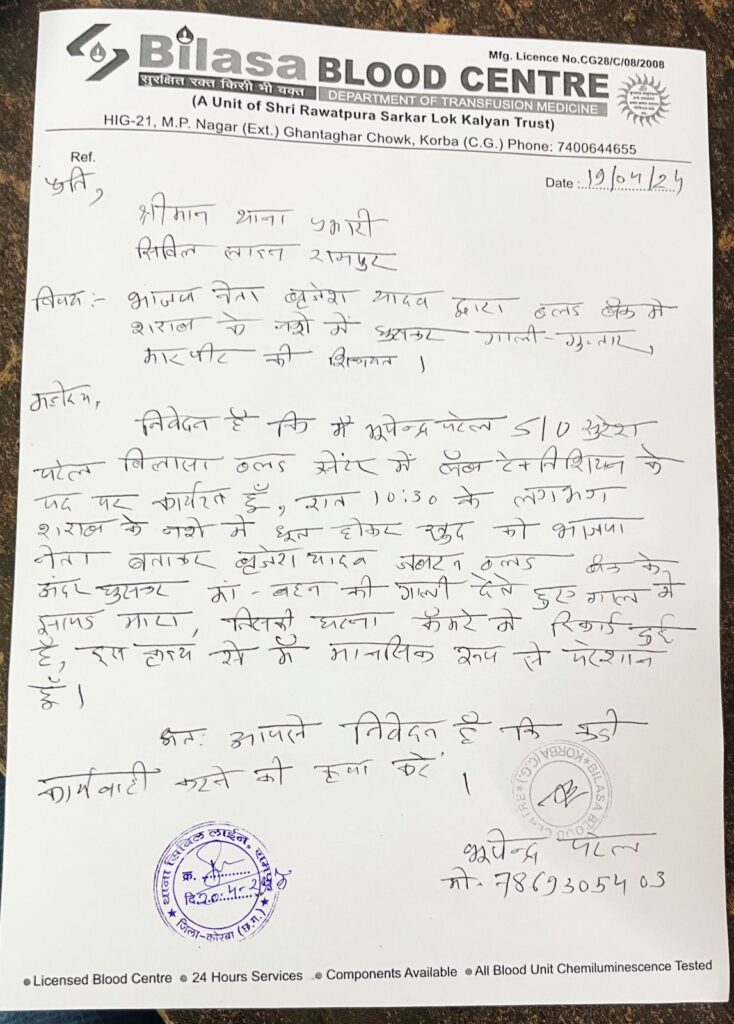 कोरबा (खटपट न्यूज)। शहर के निहारिका क्षेत्र स्थित बिलासा ब्लड बैंक में शुक्रवार देर रात एक कथित भाजपा नेता ने यहां के कर्मचारी के साथ मारपीट को अंजाम दिया। सारी घटना सीसीटीवी कैमरा में कैद हो चुकी है। इस संबंध में पीडि़त कर्मचारी ने सिविल लाइन रामपुर थाना में लिखित शिकायत दर्ज करा दिया है। कर्मचारी लैब टेक्नीशियन भूपेंद्र पटेल ने बताया कि रात करीब 10.30 बजे वह ड्यूटी पर था कि यहां पहुंचे बृजेश यादव ने खुद को भाजपा नेता बताते हुए शराब के नशे में धुत्त होकर गाली गलौज करते हुए हाथ झापड़ से मारपीट किया है।