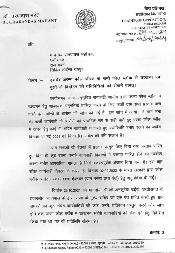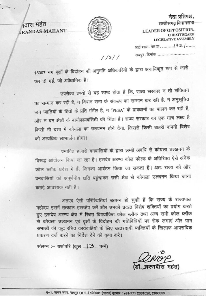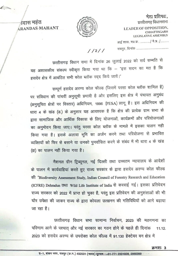 नेता प्रतिपक्ष डॉ. चरणदास महंत ने मुख्यमंत्री को अवगत कराया है कि 26 जुलाई 2022 को छत्तीसगढ़ विधानसभा ने हसदेव क्षेत्र की जलग्रहण क्षमता, बायोडायवर्सिटी और मानव हाथी द्वंद के कारण क्षेत्र के सभी कोल ब्लाक आबंटन और खनन अनुमति रद्द करने का सर्वसम्मति से प्रस्ताव पास किया था जिसे भाजपा ने भी पूर्ण समर्थन दिया। इसके बाद दिसंबर में भाजपा सरकार ने अपने शपथ ग्रहण से पहले ही राजस्थान-अडाणी की कोयला खदान के विस्तार और पेड़ कटाई की अनुमति दे दी।
