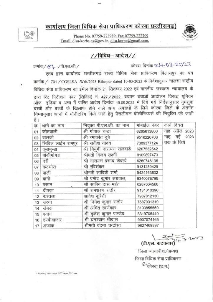 कोरबा(खटपट न्यूज़)। उच्चतम न्यायालय के द्वारा रिट पिटीशन बचपन बचाओ आंदोलन विरुद्ध यूनियंस ऑफ इंडिया व अन्य में पारित आदेश 19.09.2022 में दिए गए निर्देश गुमशुदा बच्चों और बच्चों के खिलाफ होने वाले अपराध को संज्ञान में लेकर सभी थानो में पैरालीगल वालेंटियर की नियुक्ति की जा रही है। इस सिलसिले में कोरबा जिला विधिक सेवा प्राधिकरण के अध्यक्ष एवं जिला न्यायाधीश डीएल कटकवार ने विभिन्न 17 थानों के लिए पैरालीगल वालंटियर की नियुक्ति की गई है। इनमें कांग्रेस नेता मो.आवेश कुरैशी को करतला थाना के लिए नियुक्त किया गया है। उरगा थाना के लिए निमेश कुमार राठौर को पैरालीगल वालंटियर नियुक्त किया गया है।