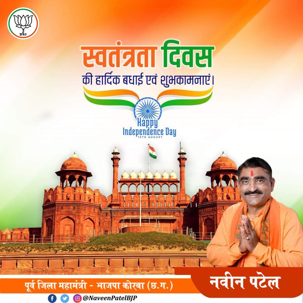 कोरबा(खटपट न्यूज़)। भाजपा के पूर्व महामंत्री नवीन पटेल ने आजादी के 75 वीं वर्षगांठ अमृत महोत्सव की कोरबा जिला सहित प्रदेश और देशवासियों को अपनी शुभकामनाएं प्रेषित की है। उन्होंने कहा है कि 76वां स्वतंत्रता दिवस सभी क्षेत्र वासियों के लिए शुभ हो। आपसी सौहार्दपूर्ण वातावरण एवं भाईचारा के साथ हम देश भक्ति के इस त्योहार को हर्षोल्लासपूर्वक मनाएं। श्री पटेल ने कहा कि कुछ नशा तिरंगे की आन का है,कुछ नशा मातृभूमि के शान का है। इस तिरंगे की शान कभी कम नहीं होने देंगे। उन्होंने क्षेत्रवासियों को पुनः शुभकामनाएं प्रेषित की है।