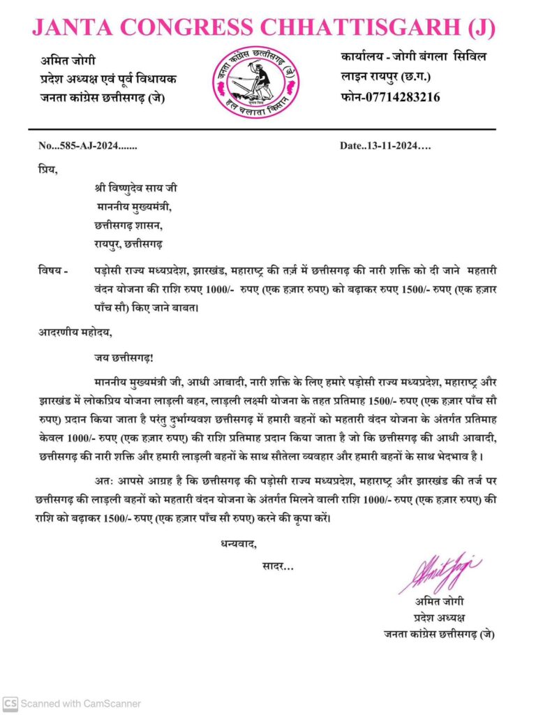 अमित जोगी ने मुख्यमंत्री श्री साय से छत्तीसगढ़ की पड़ोसी राज्य मध्यप्रदेश, महाराष्ट्र और झारखंड की तर्ज पर छत्तीसगढ़ की लाड़ली बहनों को महतारी वंदन योजना के अंतर्गत मिलने वाली राशि 1000/- रुपए (एक हज़ार रुपए) की राशि को बढ़ाकर 1500/- रुपए (एक हज़ार पाँच सौ रुपए) करने का आग्रह किया है।
