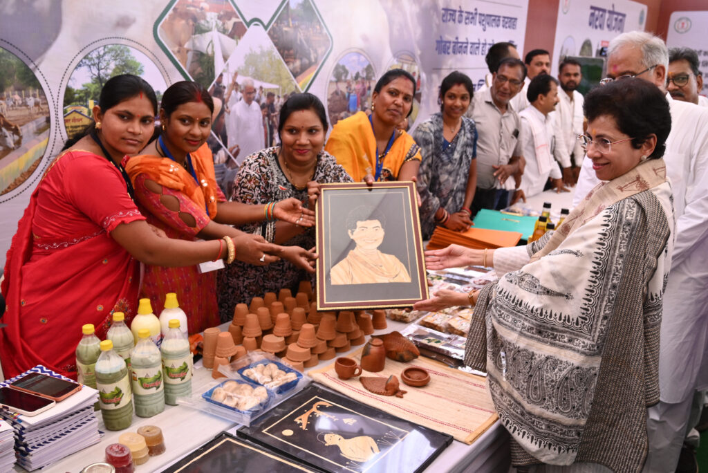 मुख्यमंत्री एवं पूर्व केन्द्रीय मंत्री सुश्री शैलजा कुमारी ने दुर्ग जिले के सिरसाखुर्द गौठान के जय बजरंग स्व-सहायता समूह द्वारा बनाए गए गोबर के उत्पादों की सराहना की। इस समूह ने मुख्यमंत्री को गोबर से बनाए गए महात्मा बुद्ध की पेंटिग एवं ट्रायबल आर्ट भेंट स्वरूप दी। वहीं बेमेतरा जिले के नवागढ़ गौठान के स्व-सहायता समूह द्वारा सुश्री शैलजा कुमारी को पैरा आर्ट उपहार स्वरूप दिया गया। इस अवसर पर अन्य मंत्रीगण और अधिकारीगण उपस्थित थे।