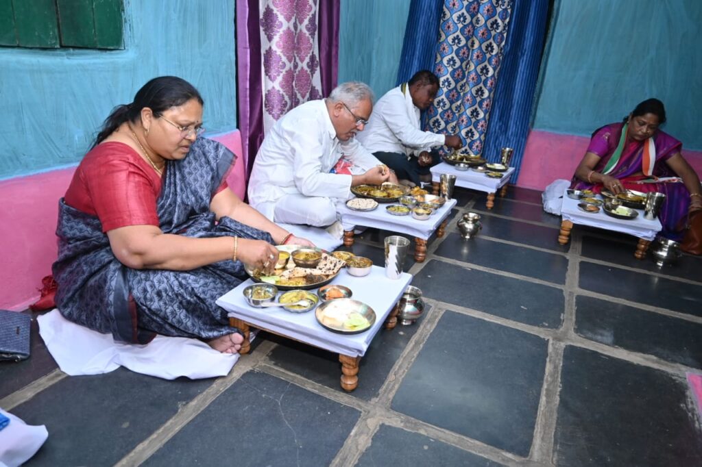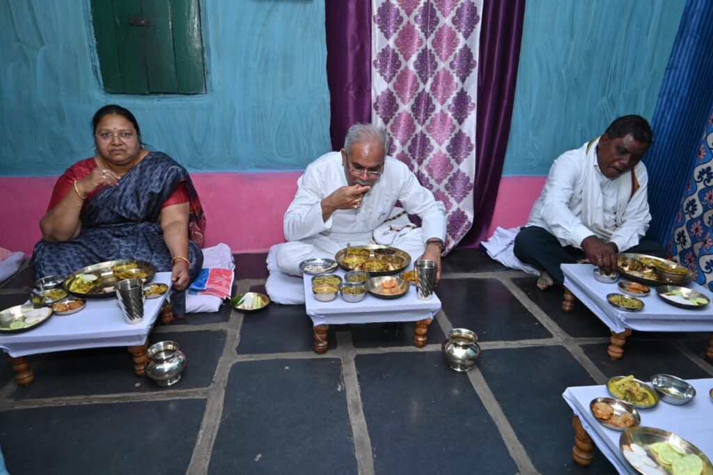 60 वर्षीय आदिवासी किसान श्रमिक श्री नेताम ने घर पहुंचने पर परिवार ने पूरी आत्मीयता मुख्यमंत्री का स्वागत तिलक और आरती से किया। मुख्यमंत्री को यहां घर पर बने पारंपरिक छत्तीसगढ़िया व्यजनों का भोजन परोसा गया। जिसमें नगरी का प्रसिद्ध दुबराज चाँवल के साथ उड़द बड़ा, रोटी, अरहर दाल, मुनगा- आलू बड़ी, खट्टा में मूली भाटा, लाल भाजी, चना भाजी, भथुवा भाजी, टमाटर चटनी, आचार व पापड़ का मुख्यमंत्री ने स्वाद लिया।
