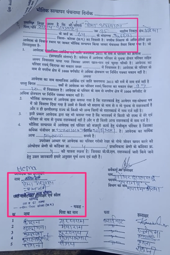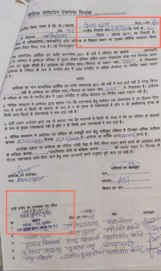 बांकीमोंगरा जोन क्षेत्र के वार्ड क्रमांक 64 के राशन कार्ड आवेदन में वार्ड 66 व 67 के पार्षद द्वारा सील लगाकर हस्ताक्षर किया जा रहा है। वार्ड 64 घुड़देवा के पार्षद पवन गुप्ता ने बताया कि राशन कार्ड के एवज में नगर निगम की मिलीभगत से बांकी जोन से कम्प्यूटर आपरेटर ब्रिजेश यादव , कोरबा निगम से ओमकार साहू एवं पार्षद द्वारा 2 से ढाई हजार रुपये लिया जा रहा है। पार्षद गुप्ता ने बताया कि उसके वार्ड के राशनकार्ड फार्म में वार्ड 66-67 के पार्षद अपने सील व हस्ताक्षर का उपयोग कर रहे हैं। पवन गुप्ता ने बताया कि उसके द्वारा अपने वार्ड के 10-12 लोगों का आवेदन एक वर्ष पहले राशन कार्ड बनाने के लिए नगर निगम बांकी जोन कार्यालय में दिया गया है मगर अभी तक राशन कार्ड नहीं बना है। उसे सिर्फ आश्वासन देते एक वर्ष से अधिक हो गया मगर कार्ड नहीं बना। उसके वार्ड का राशन कार्ड दूसरे वार्ड के पार्षद बनाने के लिए दे रहे हैं जो बनकर आ जा रहे हैं। पार्षद गुप्ता ने कहा है कि मैंने जिसका फार्म नहीं भरा है, उसका राशन कार्ड बन रहा है और मेरा सील व हस्ताक्षर ना रहकर दूसरे पार्षद का सील व हस्ताक्षर किया जा रहा है। घुड़देवा के पार्षद पवन गुप्ता ने महापौर सहित निगम अधिकारियों से शिकायत कर दिया है। उन्हें आश्वासन दिया गया है कि इस मामले में जल्द से जांच कर कार्यवाही की जाएगी।