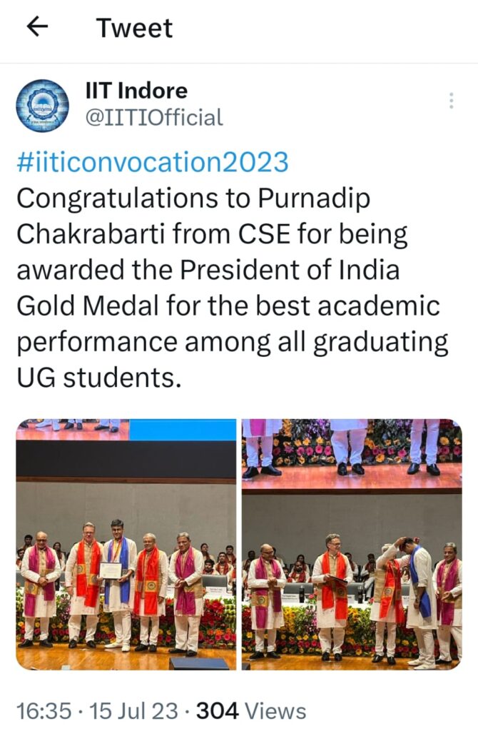 समारोह में कंप्यूटर साइंस & इंजीनियरिंग के छात्र पूर्णदीप चक्रवर्ती को सभी स्नातक डिग्री प्राप्तकर्ताओं मे से सर्वश्रेष्ठ अकादमिक प्रदर्शन के लिए राष्ट्रपति स्वर्ण पदक से सम्मानित किया गया।