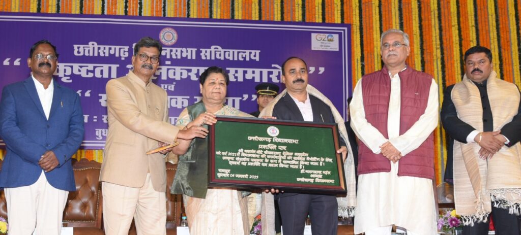 रायपुर, (खटपट न्यूज)। राज्यपाल सुश्री अनुसुईया उइके बुधवार को छत्तीसगढ़ विधानसभा द्वारा आयोजित ’’उत्कृष्टता अलंकरण समारोह’’ तथा सांस्कृतिक संध्या में शामिल हुई। राज्यपाल सुश्री उइके ने इस अवसर पर उत्कृष्ट विधायकों, उत्कृष्ट संसदीय पत्रकारों को प्रशस्ति पत्र देकर सम्मानित किया तथा उन्हें बधाई एवं शुभकामनाएं दी। समारोह की अध्यक्षता विधान सभा अध्यक्ष डॉ. चरणदास महंत ने की तथा अतिविशिष्ट अतिथि के रूप में मुख्यमंत्री श्री भूपेश बघेल तथा विधान सभा उपाध्यक्ष श्री संतराम नेताम उपस्थित थे।