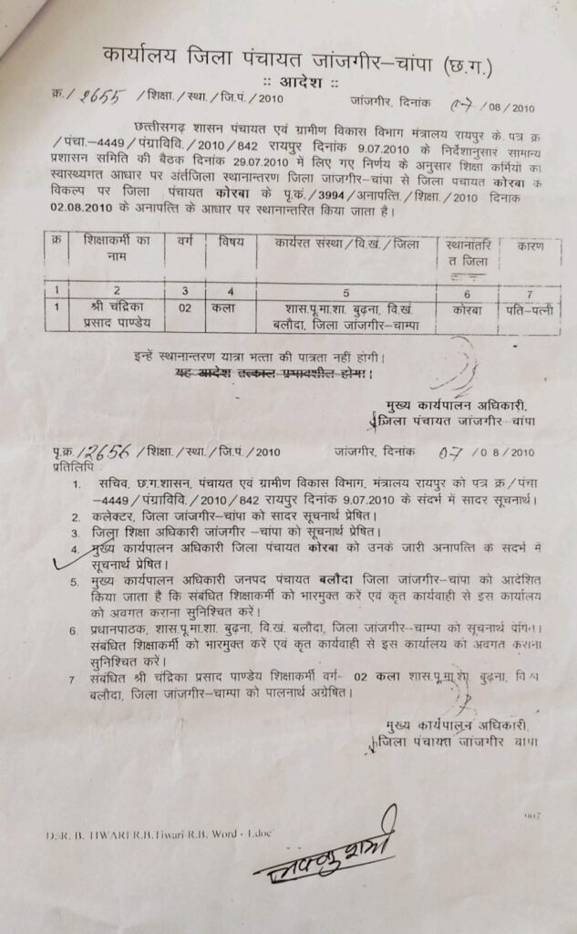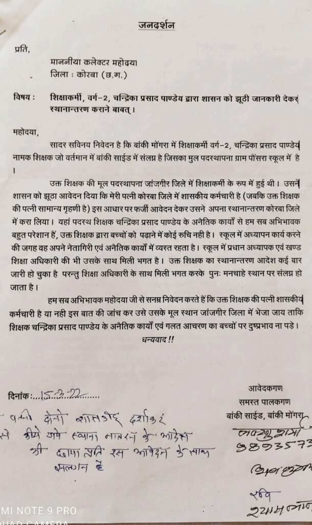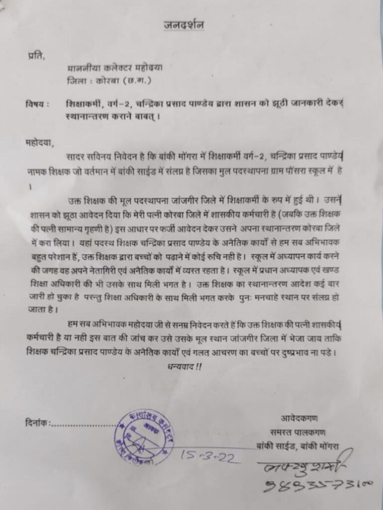 शिकायतकर्ता का असली नाम लक्खू शर्मा नहीं बल्कि लक्ष्मीचंद शर्मा है। इसके अलावा शिकायतकर्ताओं में शामिल अन्य नाम बांकी साइड स्कूल पालक नहीं है। बता दें कि लक्खू शर्मा के द्वारा जनदर्शन में शिकायत की गई है कि चंद्रिका प्रसाद पाण्डेय को जांजगीर-चाम्पा जिला पंचायत के मुख्य कार्यपालन अधिकारी द्वारा 17 अगस्त 2010 को पति-पत्नी के आधार पर कोरबा स्थानांतरण किया गया है। आरोप है कि शासन को झूठा आवेदन दिया गया कि पत्नी कोरबा में शासकीय कर्मचारी है। इस आरोप को झूठा बताते हुए चंद्रिका प्रसाद ने बताया कि वह एक विकलांग व्यक्ति है और उसकी पत्नी बांकीमोंगरा में शहीद वीरनारायण स्कूल में सहायक शिक्षिका है और मां की तबियत खराब रहती है। इस आधार पर स्थानांतरण हेतु जिला पंचायत सीईओ जांजगीर-चाम्पा को आवेदन किया गया था। चंद्रिका प्रसाद ने कहा है कि उसके विरूद्ध लक्खू शर्मा के द्वारा की गई शिकायत पूर्णत: झूठी है।