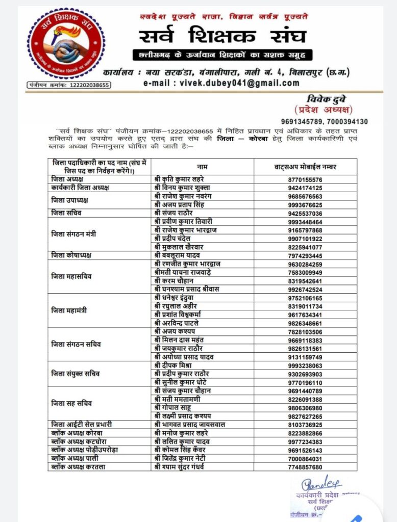 Home कोरबा सर्व शिक्षक संघ की जिला की कार्यकारिणी का विस्तार, इन्हें मिला दायित्व