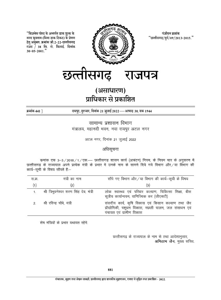 रायपुर(खटपट न्यूज)। राज्य शासन के वरिष्ठ मंत्री रविंद्र चौबे अब पंचायत एवं ग्रामीण विकास विभाग की जिम्मेदारी देखेंगे। वहीं, टीएस बाबा के पास स्वास्थ्य विभाग की जिम्मेदारी रहेगी। सिंहदेव के इस्तीफे के बाद नई जिम्मेदारी के संबंध में नोटिफिकेशन जारी कर दिया गया है।