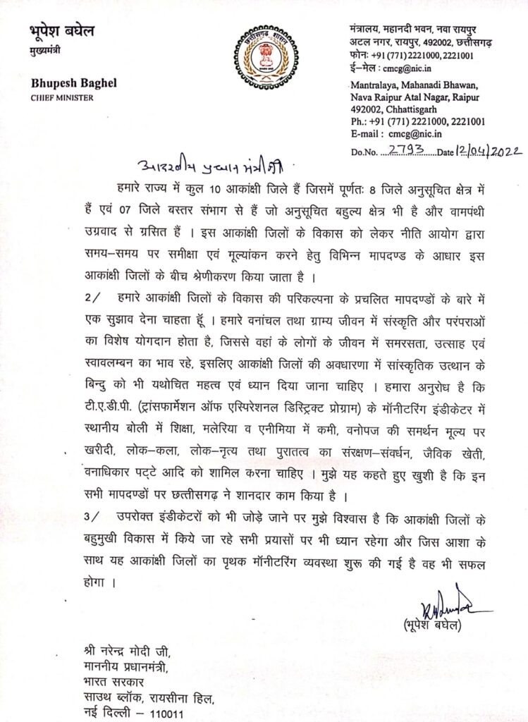 रायपुर(खटपट न्यूज़)। छत्तीसगढ़ के मुख्यमंत्री भूपेश बघेल ने प्रधानमंत्री नरेंद्र मोदी को आकांक्षी जिलों के संबंध में पत्र लिखा है। सुझाव प्रेषित किया गया है कि सांस्कृतिक उत्थान के बिंदुओं को भी इसमें शामिल किया जाए।