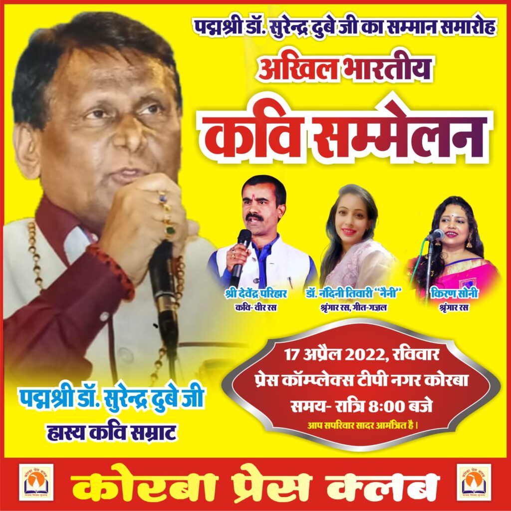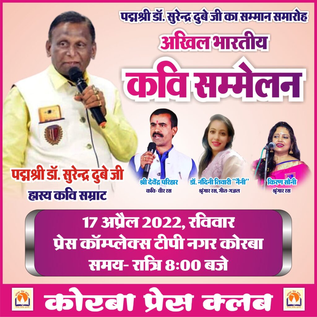 कोरबा (खटपट न्यूज)। प्रेस काम्पलेक्स टीपी नगर परिसर में 17 अप्रैल रविवार को सम्मान समारोह एवं अखिल भारतीय कवि सम्मेलन का आयोजन होने जा रहा है। छत्तीसगढ़ के सुप्रसिद्ध हास्य कवि पद्मश्री डॉ. सुरेंद्र दुबे की विशेष उपस्थिति में यह सम्मान समारोह एवंं कवि सम्मेलन होगा। इस अवसर पर वीर रस के कवि देवेन्द्र परिहार, श्रृंगार रस की कवयित्री डॉ. नंदिनी तिवारी नैनी,किरण सोनी गीत-गजलों की प्रस्तुति देंगे। 17 अप्रैल को रात्रि 8 बजे से होने वाले इस आयोजन में प्रेस क्लब के पदाधिकारियों व सदस्यों ने सहपरिवार उपस्थित होने का आग्रह किया है।