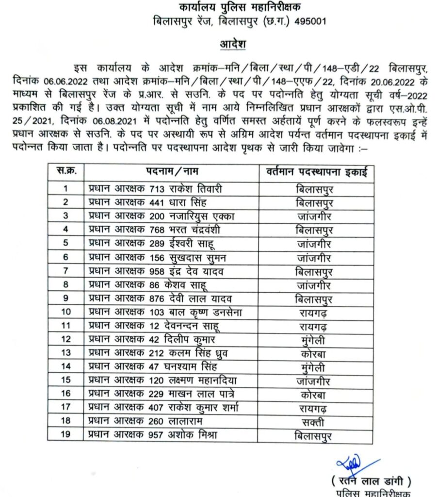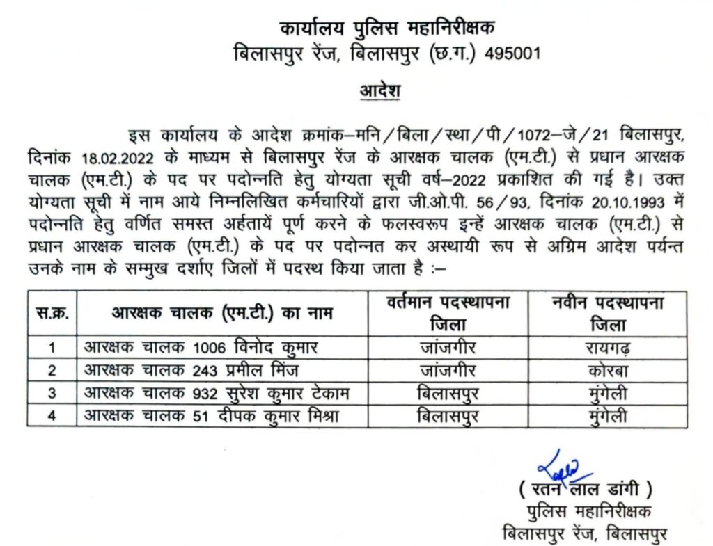 बिलासपुर(खटपट न्यूज़)। बिलासपुर रेंज के पुलिस महानिरीक्षक रतन लाल डांगी द्वारा 9 नवम्बर को रेंज अंतर्गत सहायक उप निरीक्षक एवं प्रधान आरक्षक (चालक) के पद पर पदोन्नति आदेश जारी किया गया है।