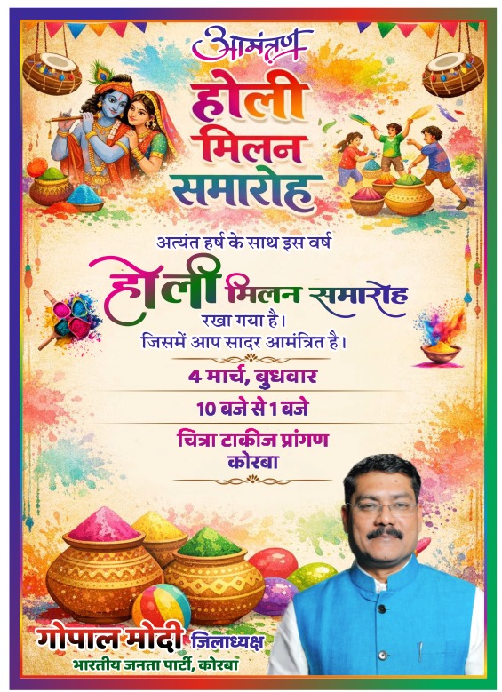 कोरबा। रंगों के पावन पर्व पर होली की भाजपा जिलाध्यक्ष गोपाल मोदी ने जिलेवासियों को दी शुभकामनाएं* चित्रा टॉकीज प्रांगण में बिखरेंगे रंग* गोपाल मोदी के संग होली का उमंगकोरबा (ईएमएस) रंगों के पावन पर्व होली के अवसर पर भारतीय जनता पार्टी जिलाध्यक्ष गोपाल मोदी द्वारा 4 मार्च बुधवार को होली मिलन समारोह का आयोजन किया जा रहा है। उक्त कार्यक्रम चित्रा टॉकीज प्रांगण, कोरबा में प्रातः 10 बजे से दोपहर 1 बजे तक आयोजित होगा।
