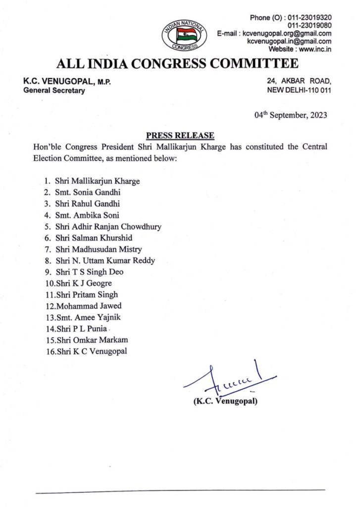 नई दिल्ली/रायपुर। कांग्रेस ने बनाई चुनाव समिति, मल्लिकार्जुन खड़गे, सोनिया गांधी और राहुल गांधी समेत 16 नेताओं को जगह मिली है। छत्तीसगढ़ राज्य के उपमुख्यमंत्री टीएस सिंहदेव भी इस समिति में शामिल किए गए हैं।