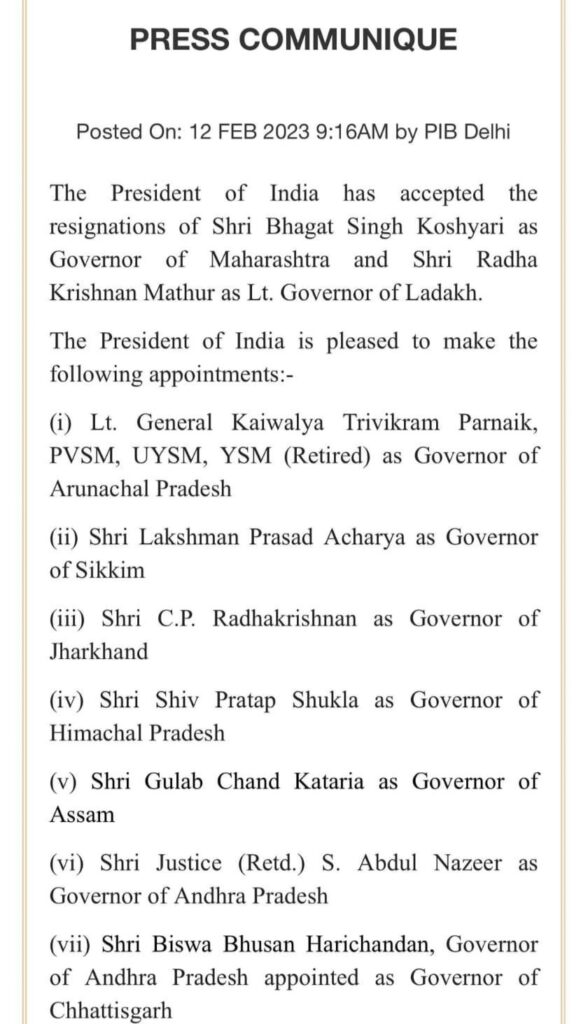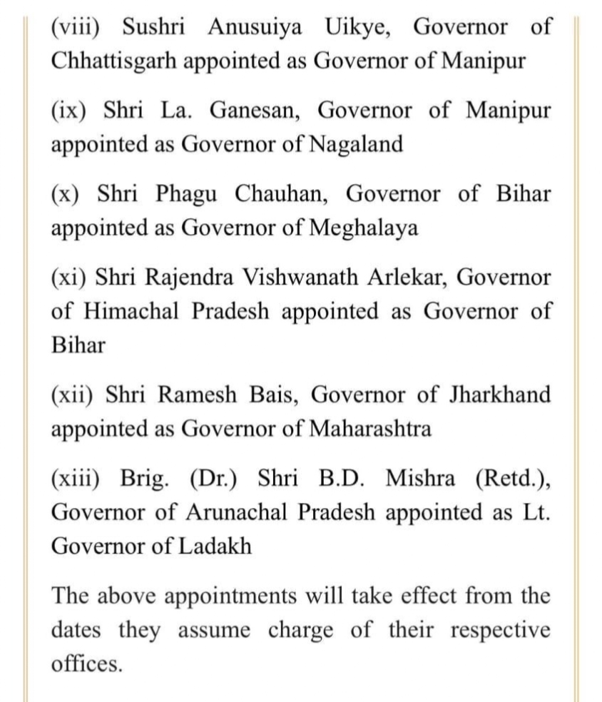 नई दिल्ली/रायपुर। केंद्र सरकार द्वारा कई राज्यों के राज्यपाल बदल दिए गए हैं। इसके साथ ही महाराष्ट्र के राज्यपाल भगत सिंह कोश्यारी का इस्तीफा राष्ट्रपति ने मंजूर कर लिया है। इस संबंध में आदेश जारी कर दिए गए हैं। छत्तीसगढ़ की राज्यपाल सुश्री अनुसूईया उईके अब मणिपुर की राज्यपाल होंगी। बी बी हरिचंदन छत्तीसगढ़ के नए राज्यपाल नियुक्त किए गए हैं।