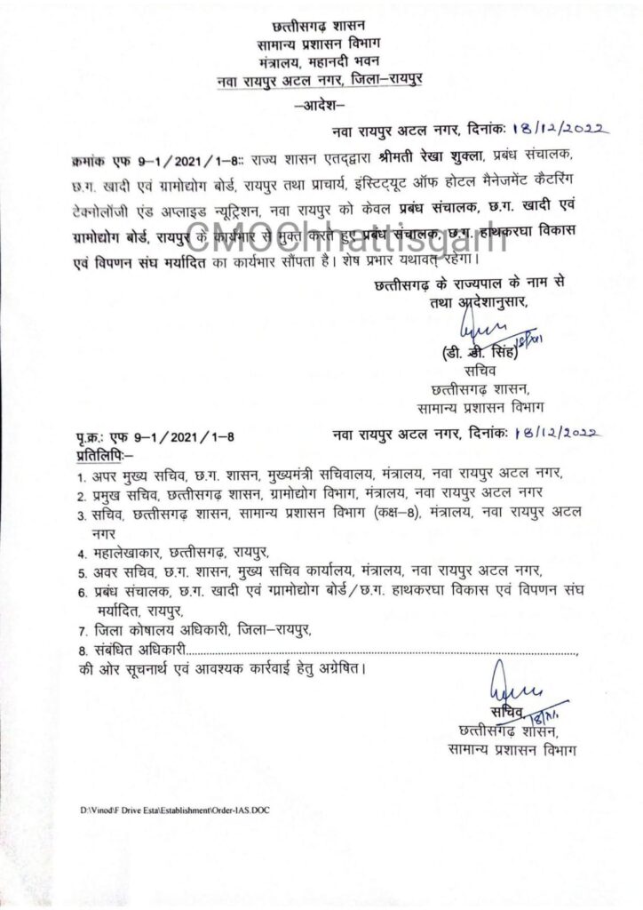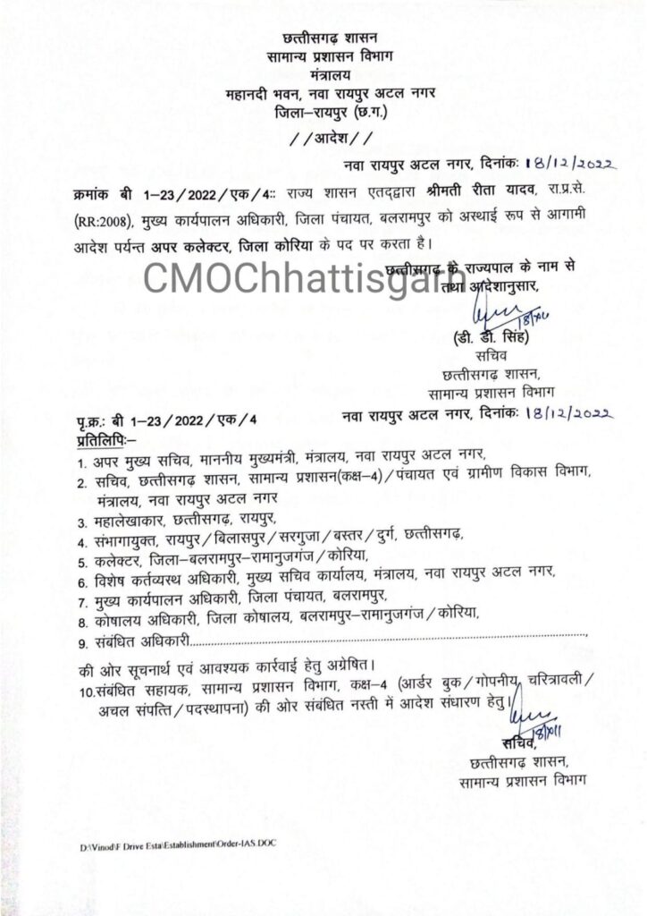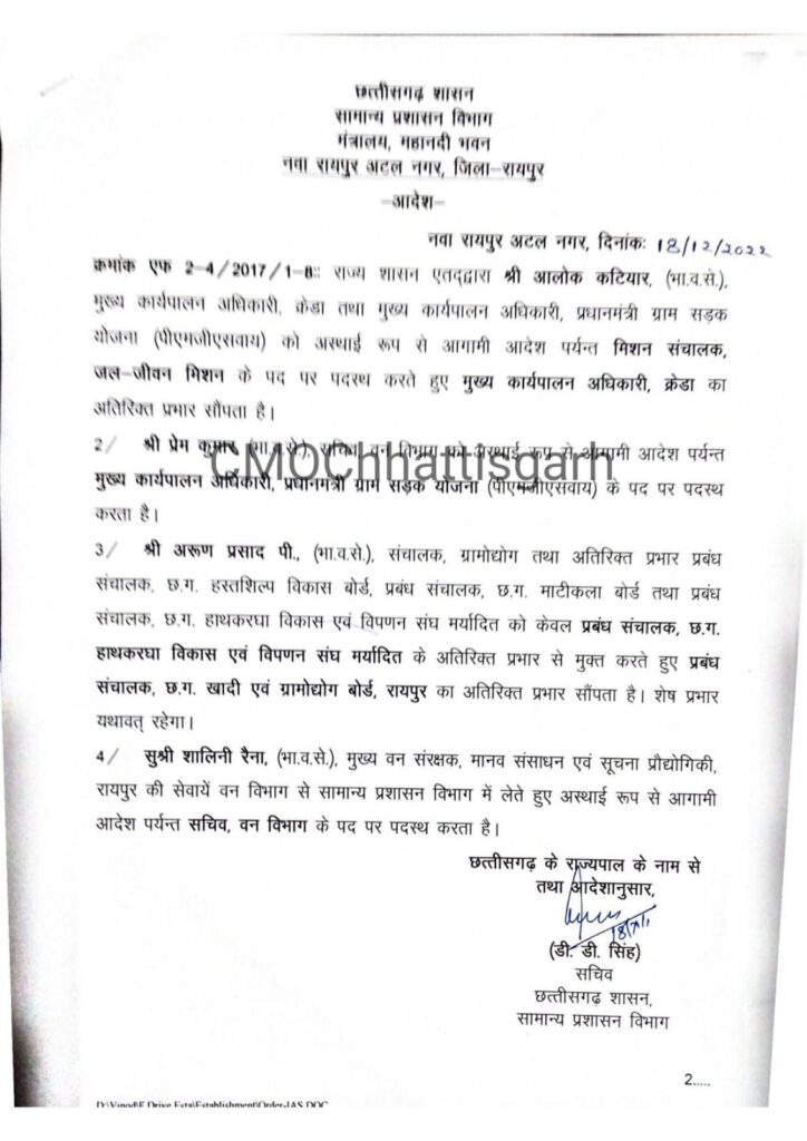 रायपुर(खटपट न्यूज)। राज्य शासन द्वारा भारतीय प्रशासनिक सेवा के अधिकारियों की नवीन पदस्थापना की गई है। भारतीय वन सेवा के भी अधिकारियों को नई जिम्मेदारी मिली है। इस संबंध में सामान्य प्रशासन विभाग द्वारा आदेश जारी कर दिया गया है।
