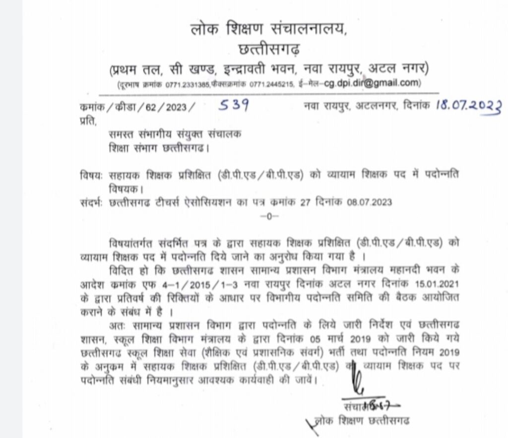 छत्तीसगढ़ टीचर्स ऐसोसियशन के द्वारा इस संदर्भ में पूर्व प्रेषित पत्र दिनांक 08.07.2023 के द्वारा सहायक शिक्षक प्रशिक्षित (डी.पी.एड/ बी.पी.एड) को व्यायाम शिक्षक पद में पदोन्नति दिये जाने का अनुरोध किया गया है।