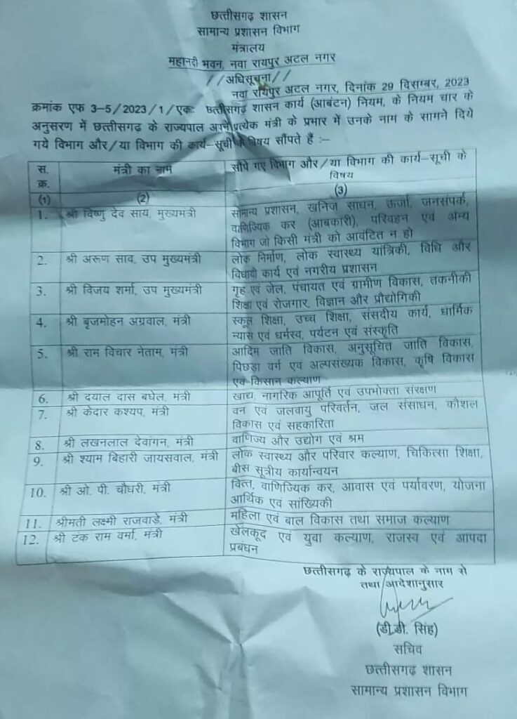 दयाल दास बघेल खाद्य नागरिक आपूर्ति एवं उपभोक्ता संरक्षण, केदार कश्यप को वन एवं जलवायु परिवर्तन, जल संसाधन, कौशल विकास एवं सहकारिता, लखनलाल देवांगन वाणिज्य और उद्योग एवं श्रम, श्याम बिहारी जायसवाल लोक स्वास्थ्य और परिवार कल्याण, चिकित्सा शिक्षा, ओपी चौधरी वित्त, वाणिज्यिक कर, आवास एवं पर्यावरण, योजना आर्थिक एवं सांख्यिकी, लक्ष्मी राजवाडे महिला एवं बाल विकास तथा समाज कल्याण, टंक राम वर्मा खेलकूद एवं युवा कल्याण, राजस्व एवं आपदा प्रबंधन विभाग संभालेंगे.
